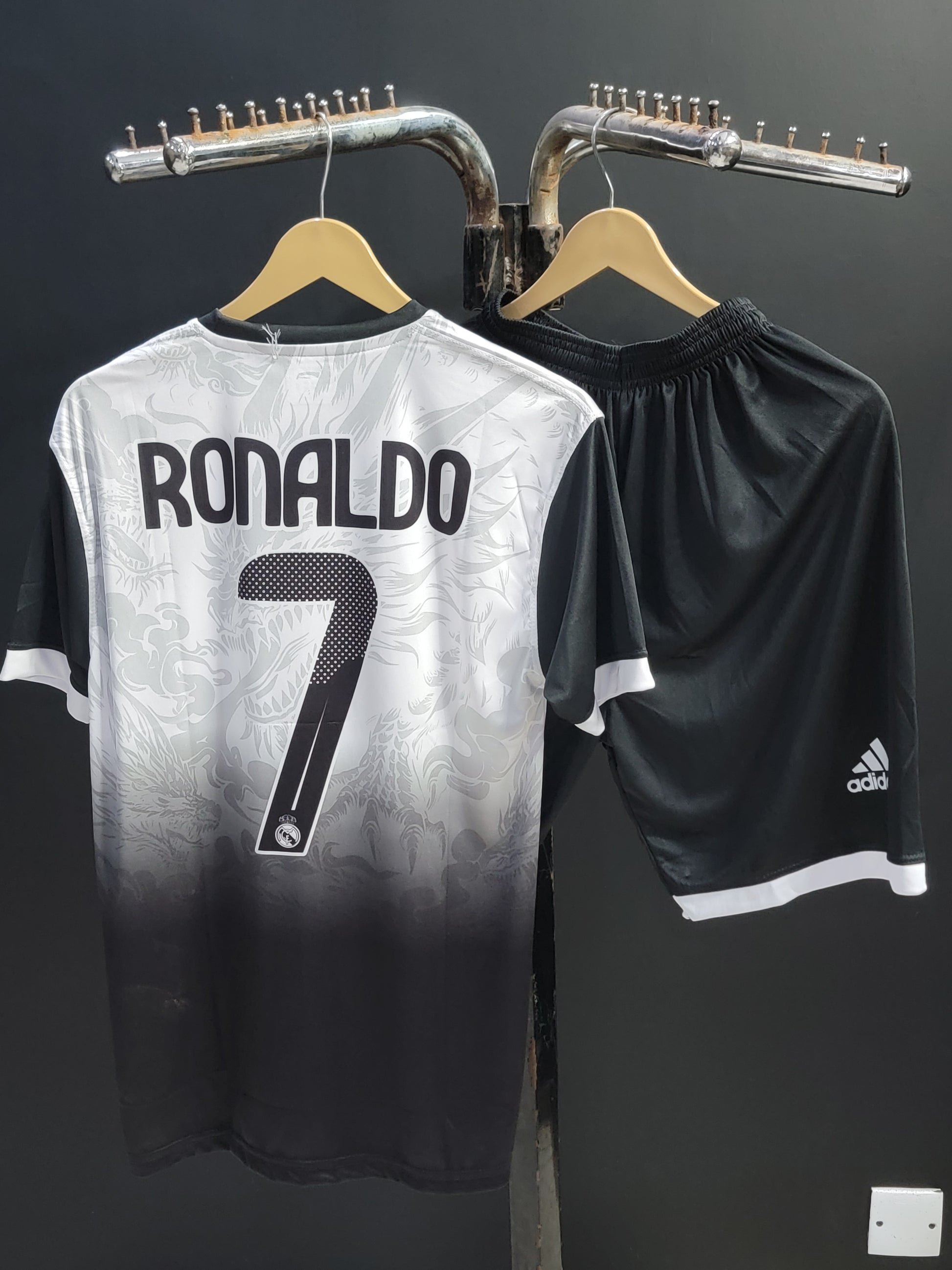 Upgrade your game with the CR7 Complete Adult football kit, featuring a superior dry-fit fabric for ultimate comfort and performance. Available in all sizes, this football jersey with shorts will take your skills to the next level. Get ready to dominate the field like a pro.